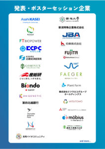 ・旭化成株式会社 ・N.CYCLEプロジェクト ・株式会社FTバイオパワー ・木村化工機株式会社 ・経済産業省近畿経済産業局 ・ゴミナクス株式会社 ・国立研究開発法人産業技術総合研究所 ・住友化学株式会社 ・3X4ジェネティクス株式会社 ・株式会社第四北越銀行 ・一般社団法人 鶴岡サイエンスパーク ・長岡技術科学大学 ・長岡バイオエコノミーコンソーシアム(長岡バイオコミュニティ) ・新潟大学 ・新潟特殊企業株式会社 ・一般財団法人バイオインダストリー協会 ・伯東株式会社 ・株式会社フジタ ・ヒューマンメタボロームテクノロジーズ株式会社 ・株式会社フェイガー ・株式会社プラントフォーム ・株式会社ミツウロコグループホールディングス ・三友商事有限会社 ・三菱ケミカルアクア・ソリューションズ株式会社 ・株式会社メビウス ・緑水工業株式会社 ほか