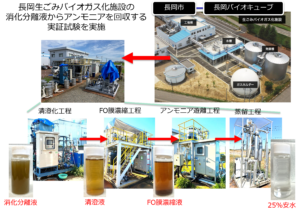 窒素循環型社会形成に向けて2025年夏に兵庫県尼崎市の木村化工機株式会社が長岡生ごみバイオガス発電センターから排出されるメタン発酵消化液からアンモニア態窒素を回収する実証試験を実施しました。